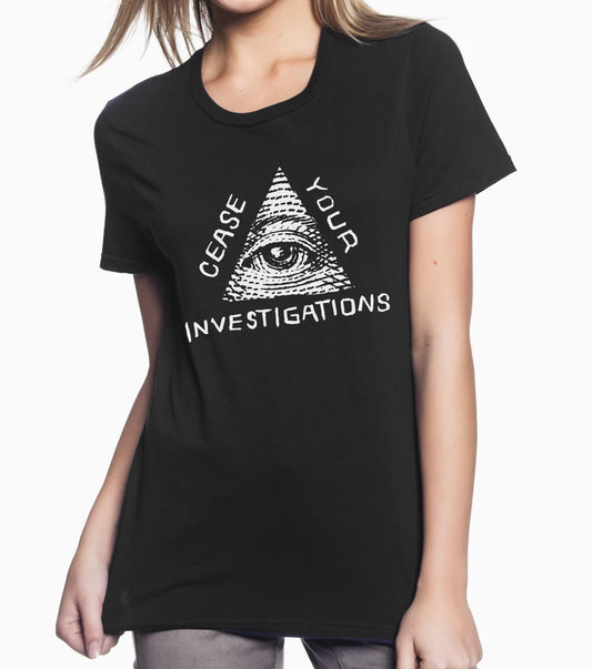CEASE YOUR INVESTIGATIONS: SECRET ILLUMINATI FEMALE CUT T-SHIRT