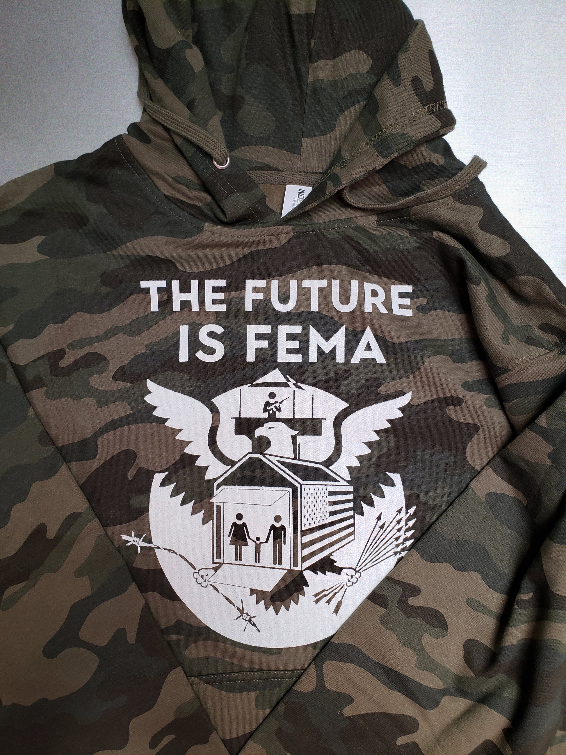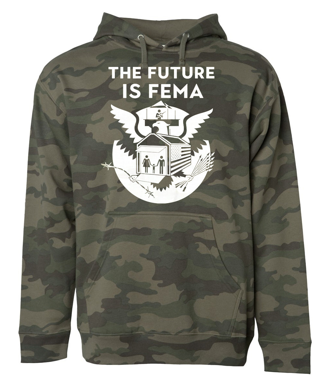 TEH FUTURE IS FEMA, in hoodie form. Keep warm in the camps with this stylish anytime hoodie.